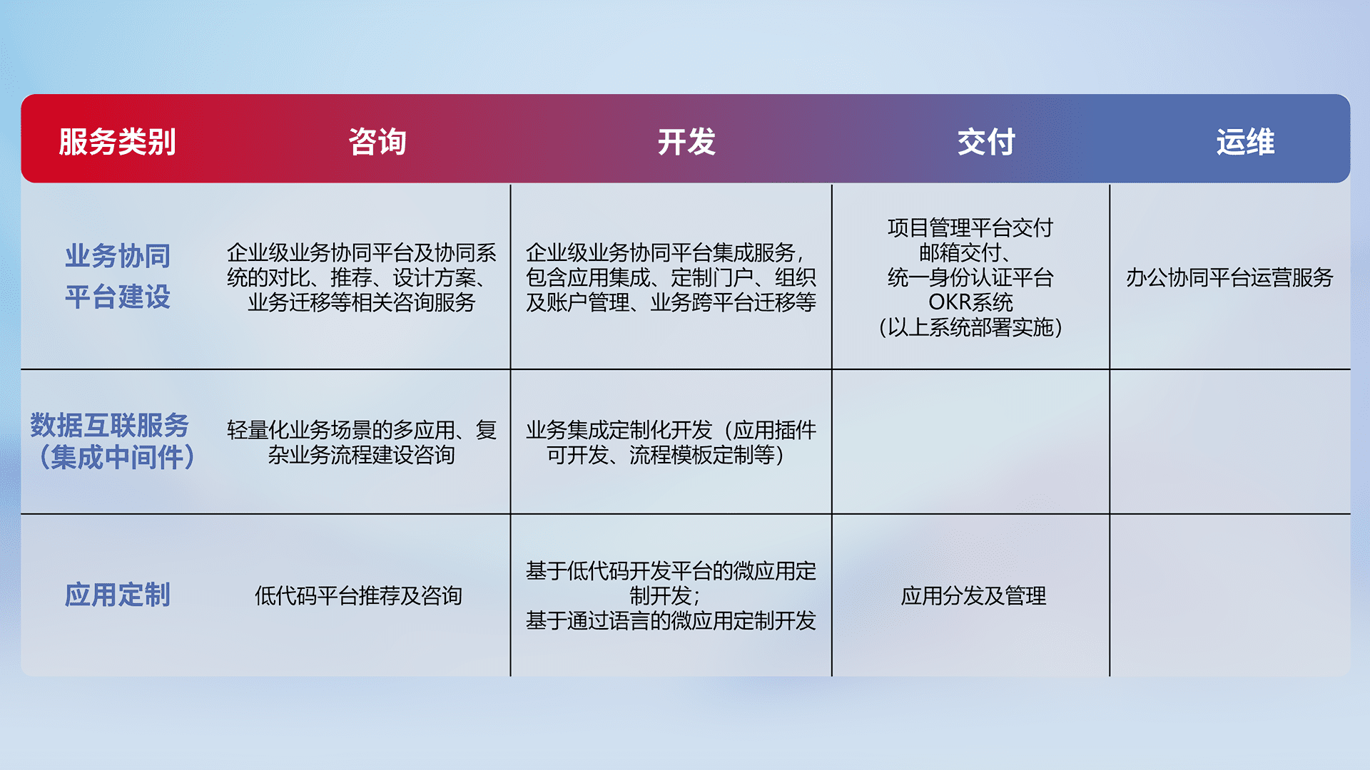 针对钉钉、、企微、、、IDaas等平台级产品提供产品的规划、、方案、、交付、、、定制化开发等服务,,实现如统一协同办公、、智能客户服务、、、、混合会议管理、、、、智能数据查询、、等业务场景,,实现数字化转型。。
